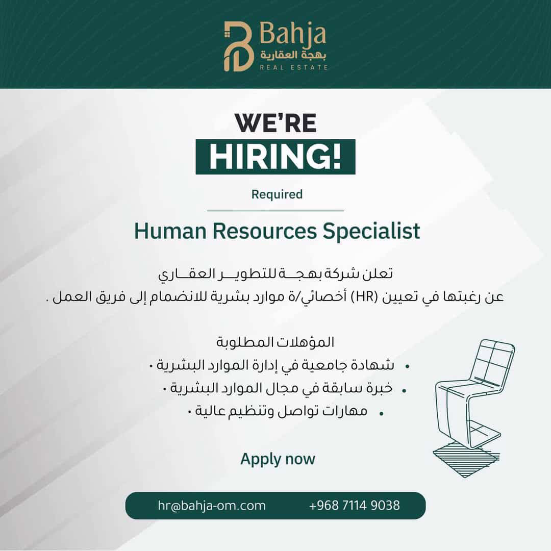 شركة بهجة للتطوير العقاري - وظيفتين شاغرتين ( أخصائي/ة موارد بشرية + مبيعات )