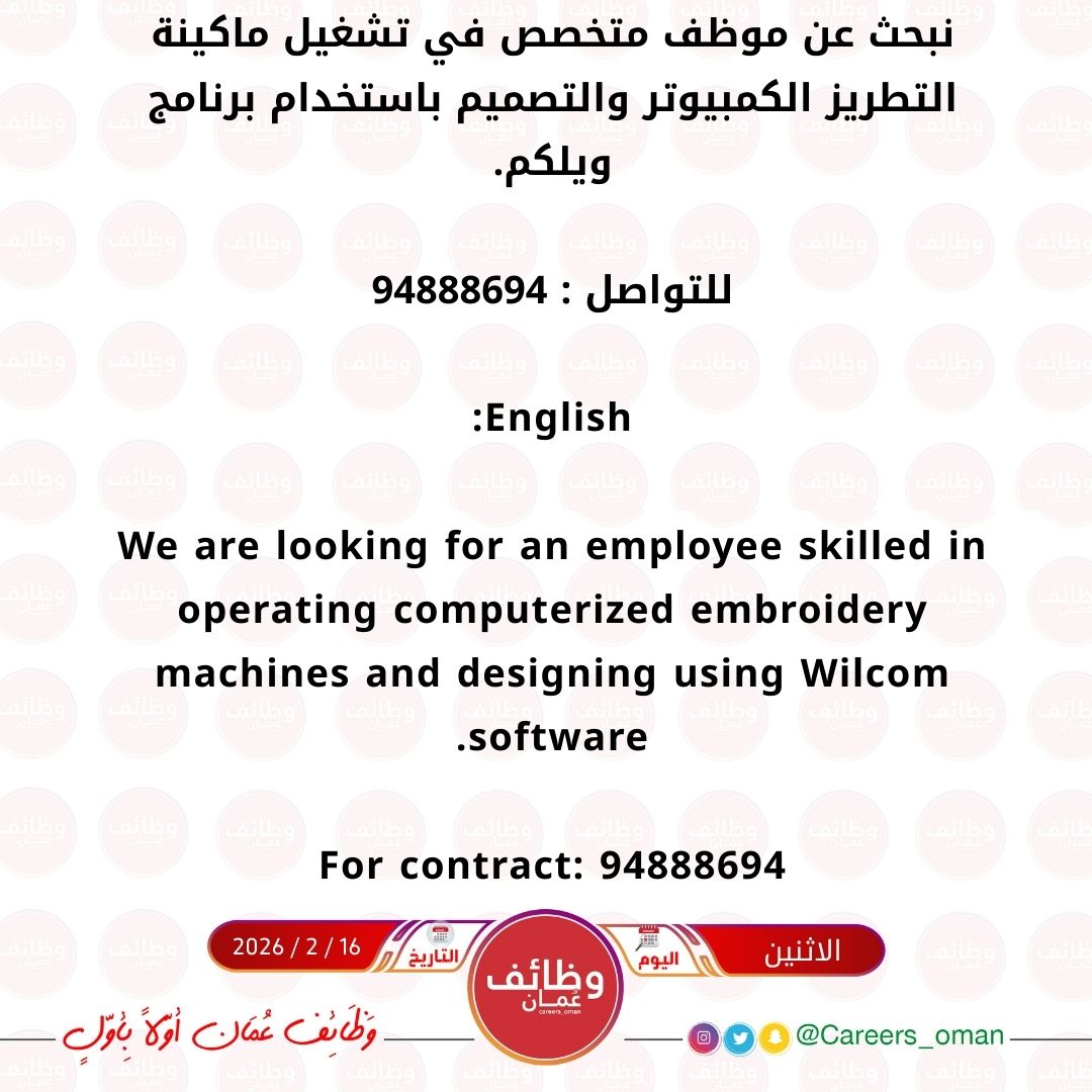 شركة بوابة التاج للتجارة في مسقط - وظيفة شاغرة ( متخصص في تشغيل ماكينة التطريز الكمبيوتر والتصميم )