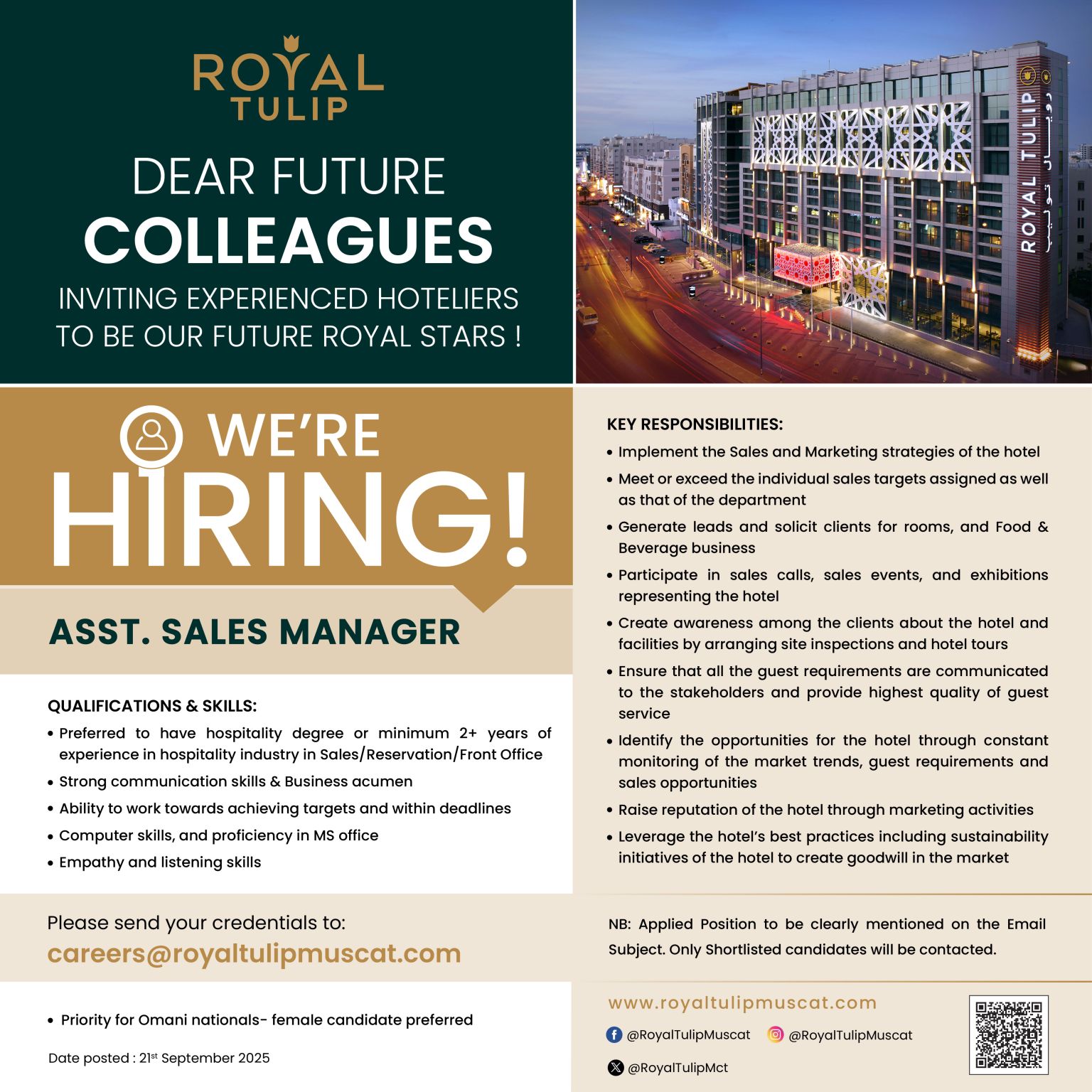 فندق رويال توليب مسقط - وظيفة شاغرة ( Assistant Sales Manager )