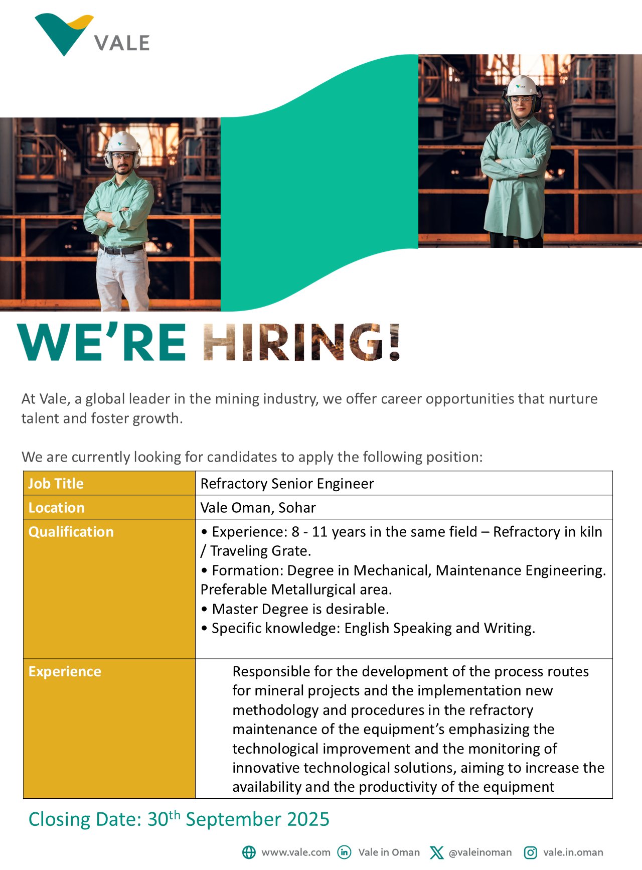 شركة فالي - وظيفة شاغرة ( Refractory Senior Engineer )