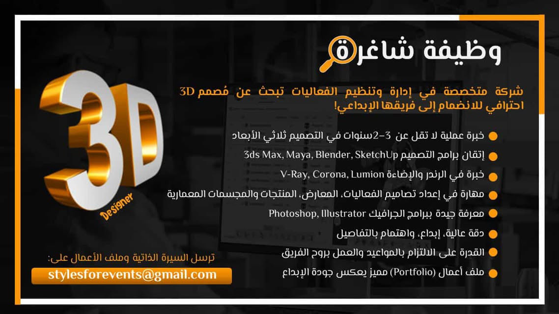 شركة متخصصة في إدارة وتنظيم الفعاليات - وظيفة شاغرة ( مصمم 3D احترافي )