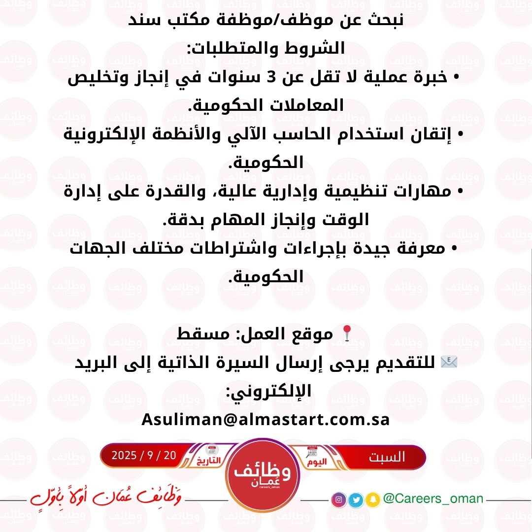 مكتب سند للخدمات في مسقط - وظيفة شاغرة ( موظف/موظفة )