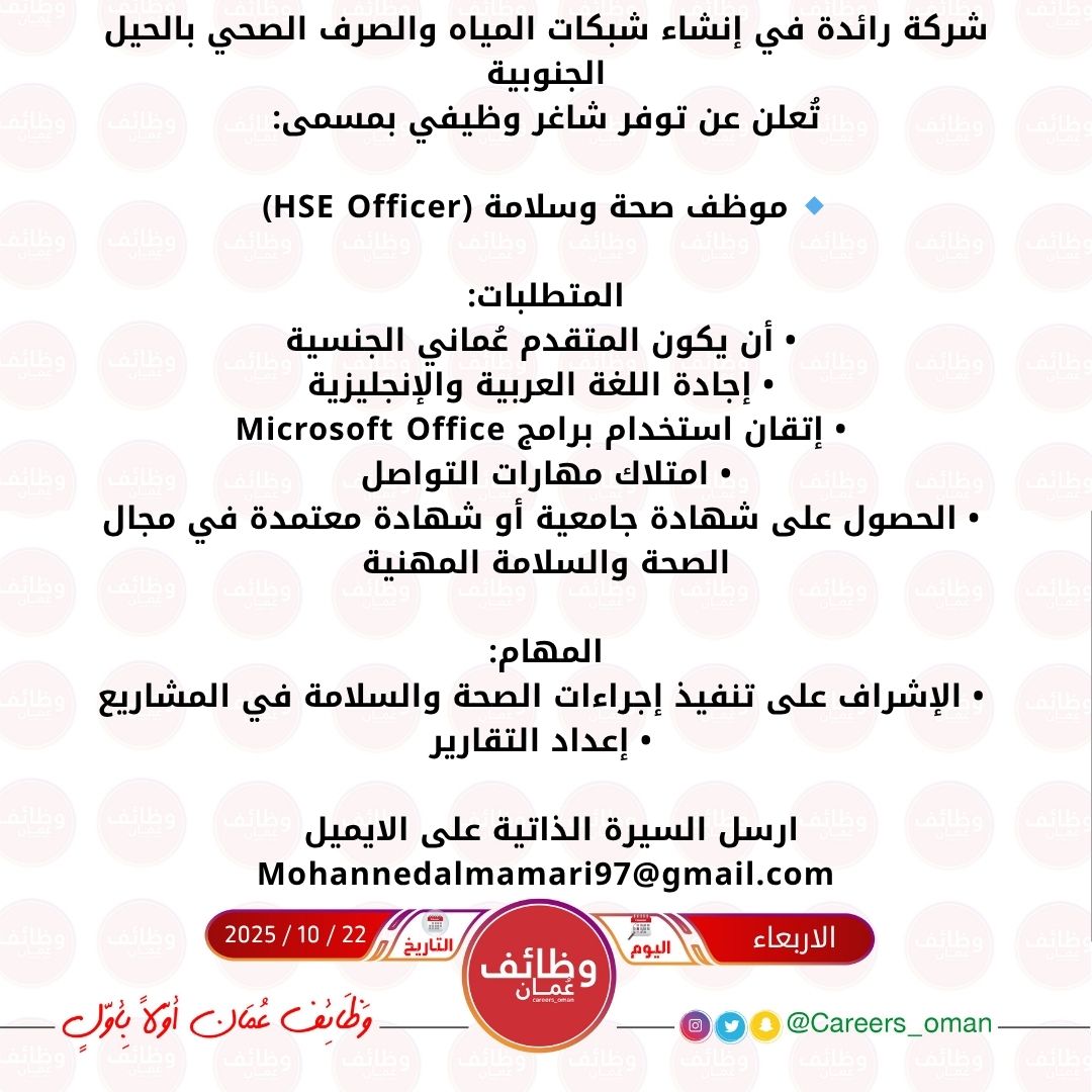 شركة رائدة في إنشاء شبكات المياه والصرف الصحي بالحيل الجنوبية - وظيفة شاغرة ( موظف صحة وسلامة HSE )