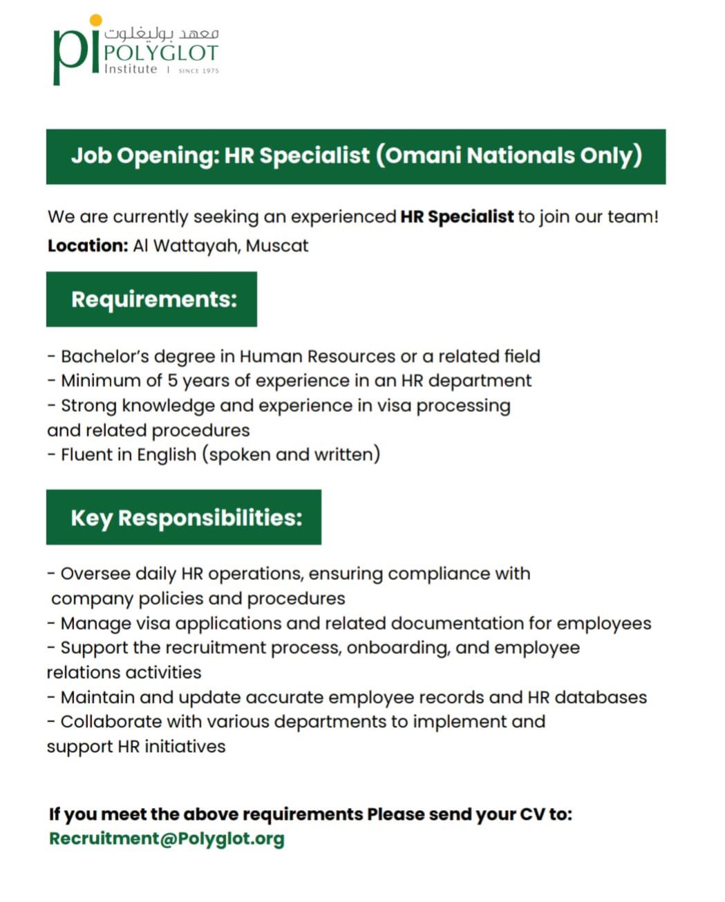 معهد بوليغلوت - وظيفة شاغرة ( HR Specialist )