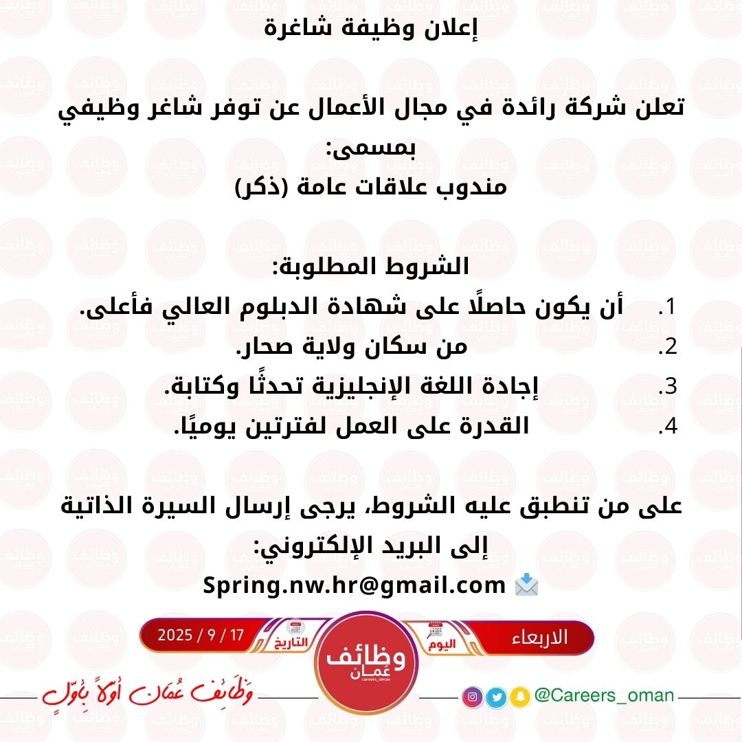 شركة رائدة في مجال الأعمال في صحار - وظيفة شاغرة ( مندوب علاقات عامة )