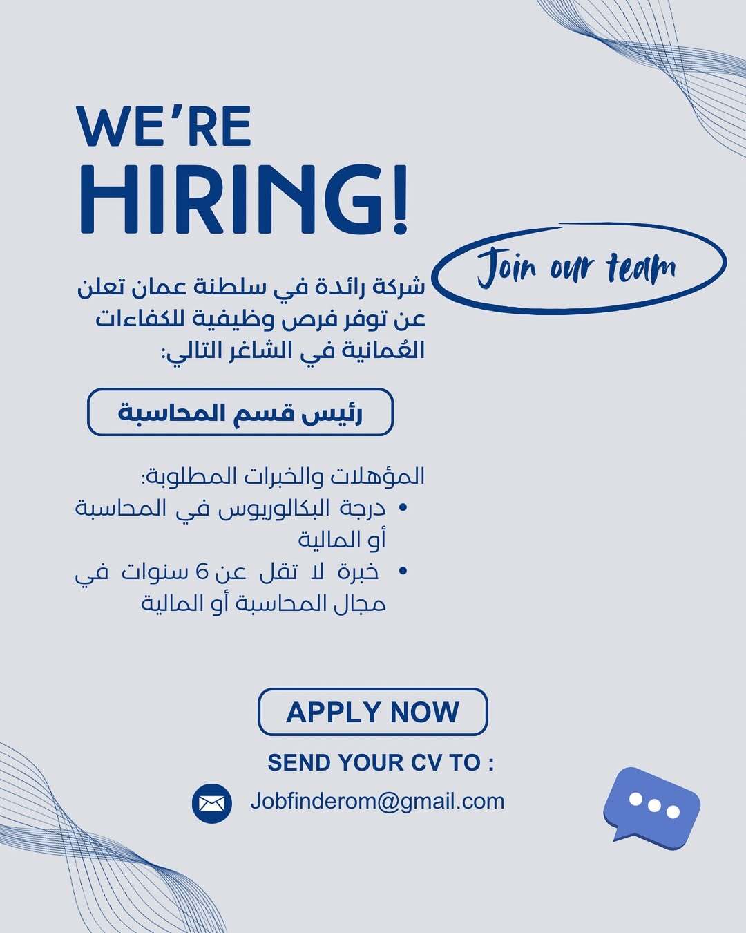 شركة رائدة في سلطنة عمان - وظيفة شاغرة ( رئيس قسم المحاسبة )