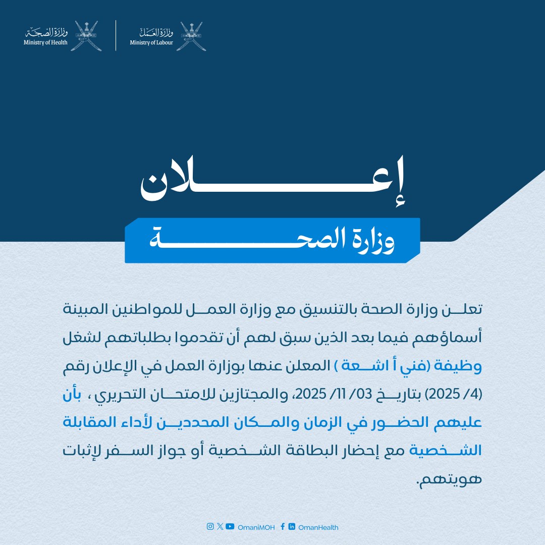 وزارة الصحة - أسماء مواطنين لأداء المقابلة الشخصية لشغل وظيفة (فني أ أشعة)