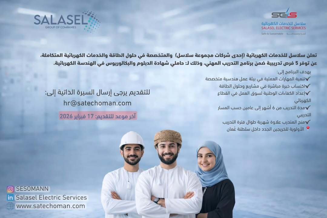 سلاسل للخدمات الكهربائية - توفر 5 فرص تدريبية ضمن برنامج التدريب المهني لحاملي شهادة الدبلوم والبكالوريوس في الهندسة الكهربائية + علاوة شهرية ( مدة التدريب 6 أشهر )
