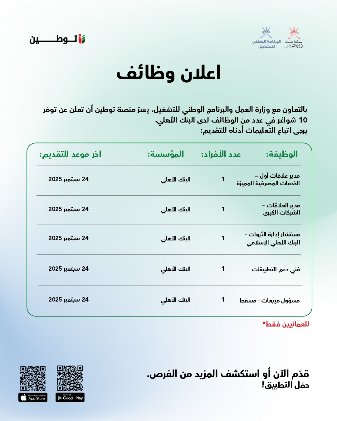 منصة توطين - 10 وظائف شاغرة لدى البنك الأهلي