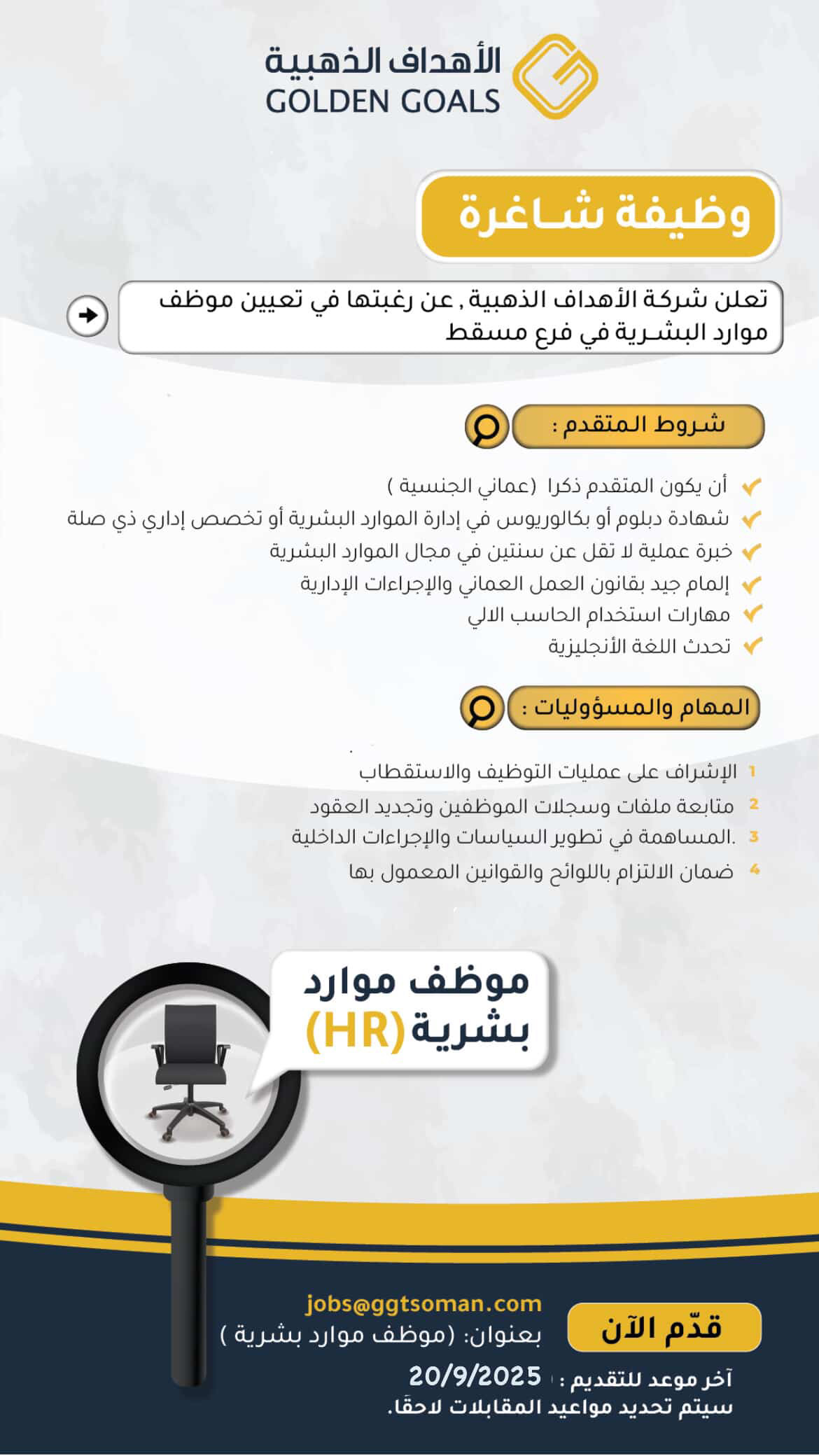 شركة الأهداف الذهبية - وظائف شاغرة ( موظف موارد البشرية + مصمم داخلي أو مهندس معماري )