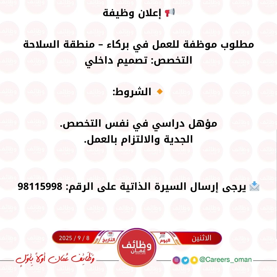 شركة رائدة في بركاء - وظيفة شاغرة ( موظفة تصميم داخلي )
