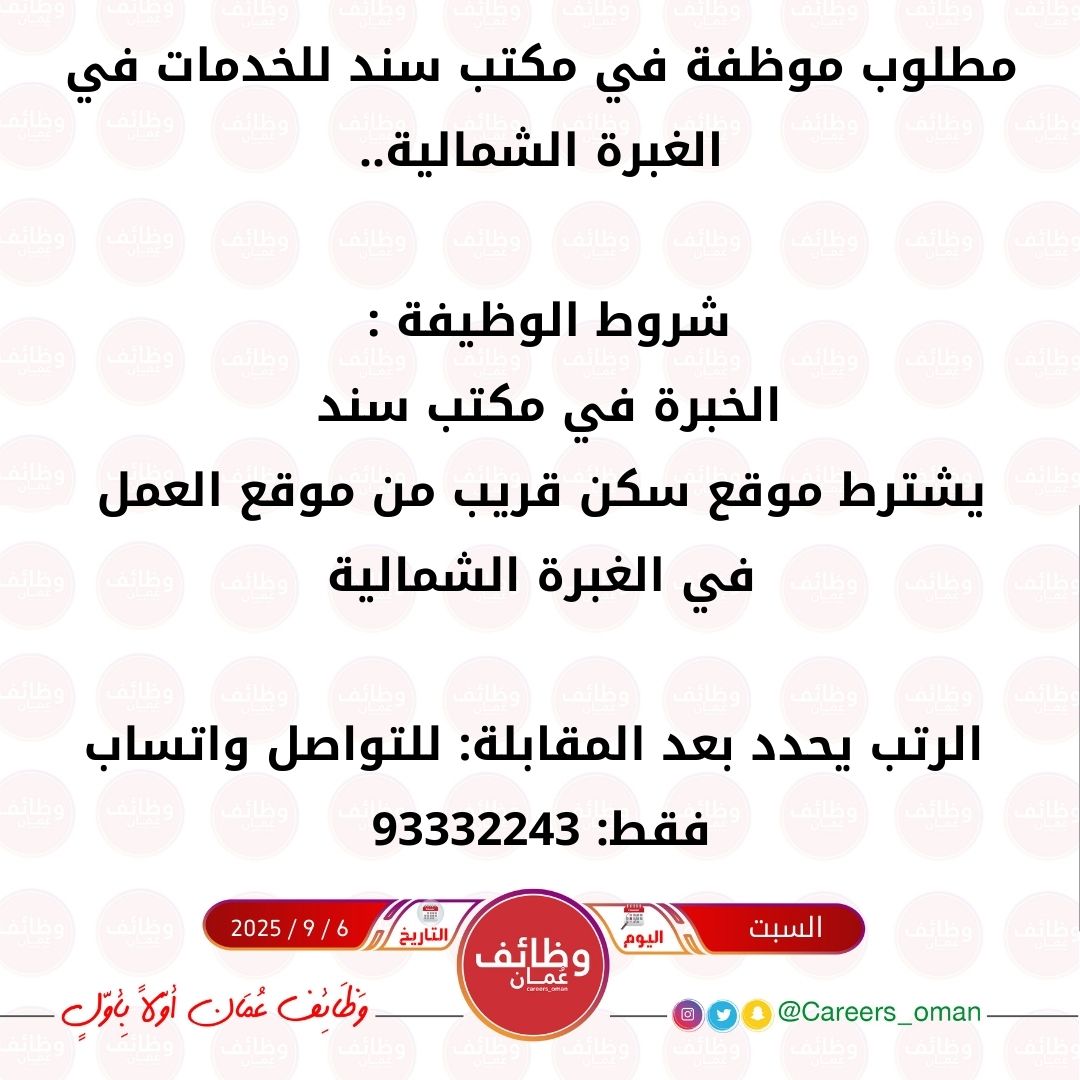 مكتب سند للخدمات في الغبرة الشمالية - وظيفة شاغرة ( موظفة )