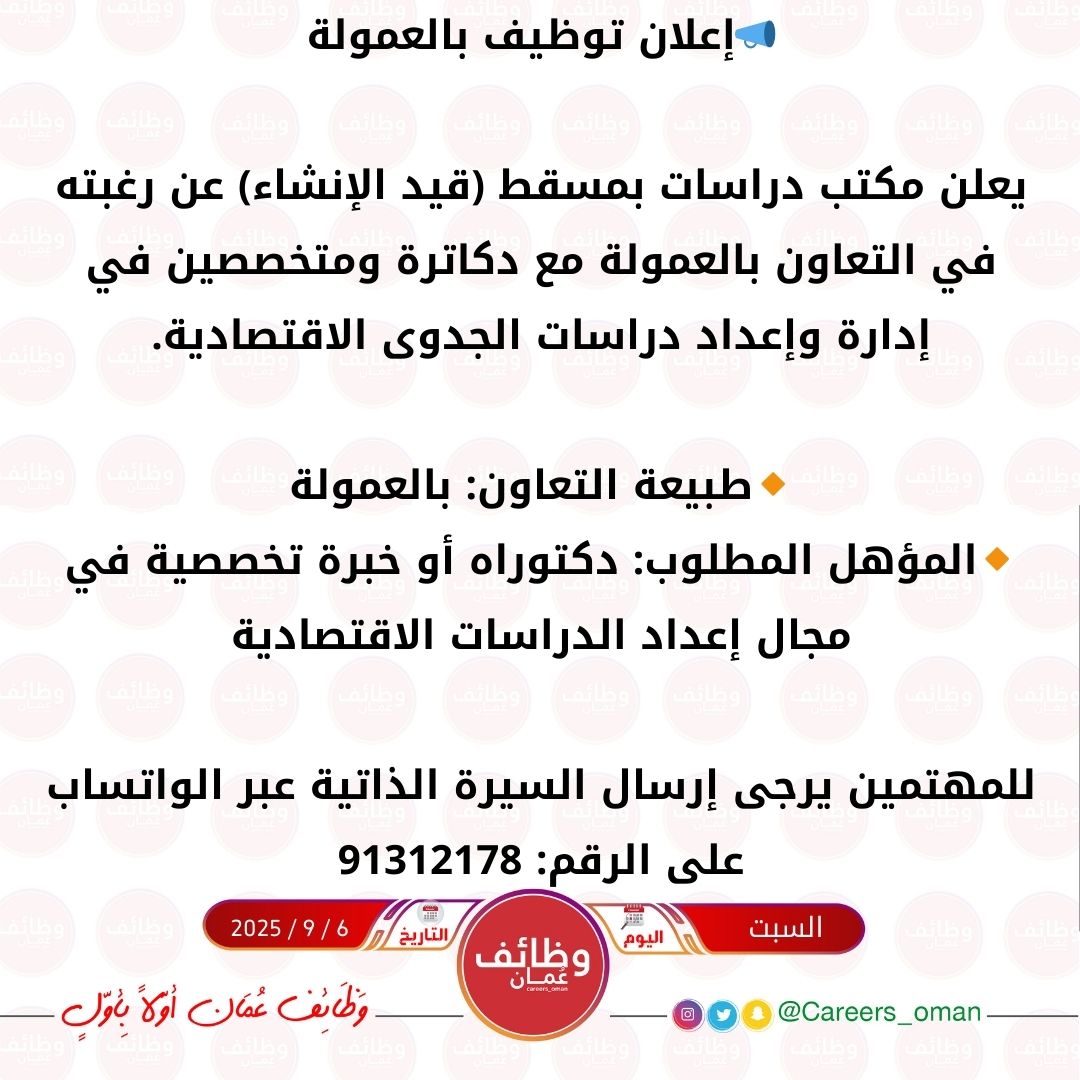 مكتب دراسات بمسقط قيد الإنشاء - وظيفة شاغرة بنظام العمولة ( دكاترة ومتخصصين في إدارة وإعداد دراسات الجدوى الاقتصادية )