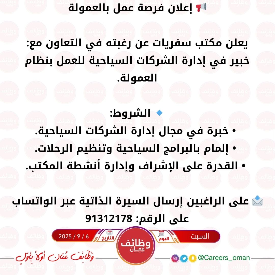 مكتب سفريات - وظيفة شاغرة بنظام العمولة ( خبير في ادارة شركة سياحية )