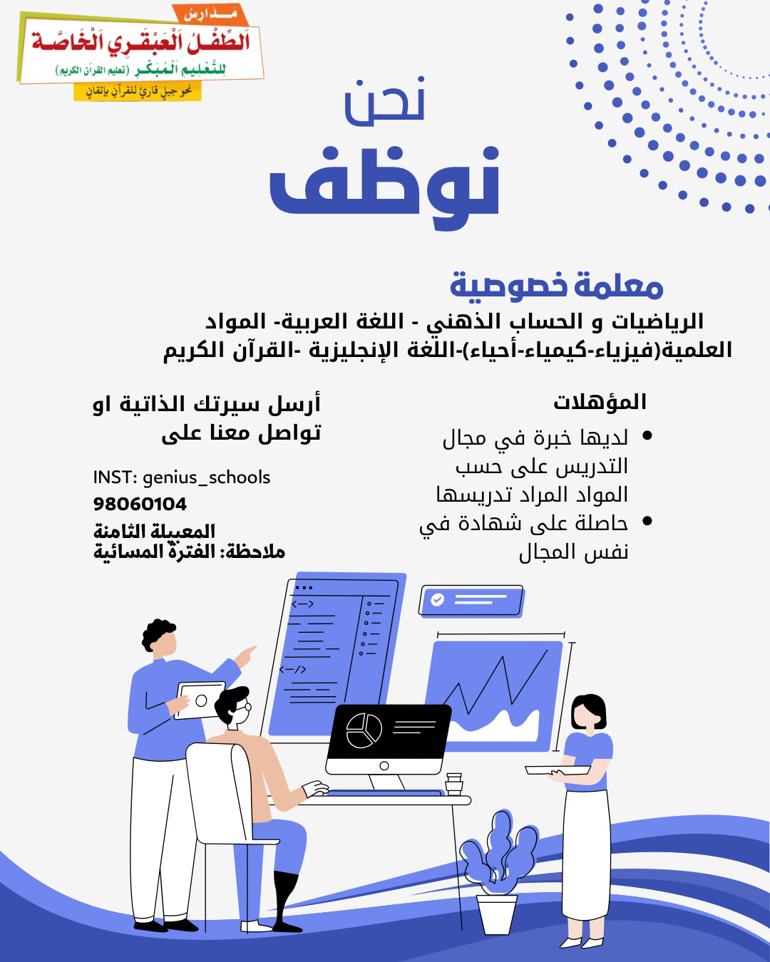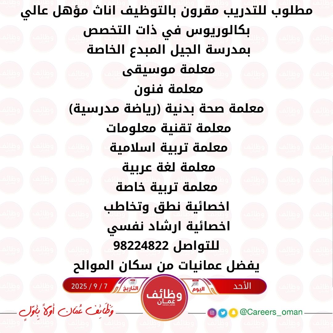 مدارس الطفل العبقري الخاصة في المعبيلة - وظيفة شاغرة ( معلمة خصوصية )