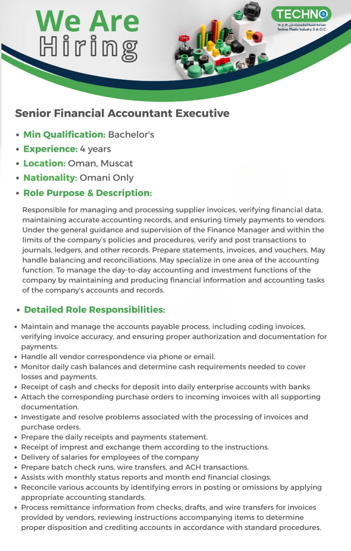 شركة صناعة تقنية البلاستيك في مسقط - وظيفة شاغرة ( Senior Financial Accountant Executive )