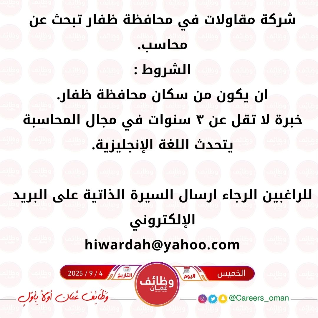 شركة مقاولات في ظفار - وظيفة شاغرة ( محاسب )