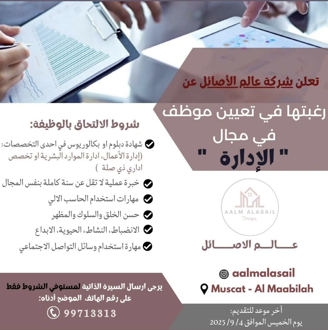 شركة عالم الأصائل في المعبيلة - وظيفة شاغرة ( موظف في مجال الإدارة )