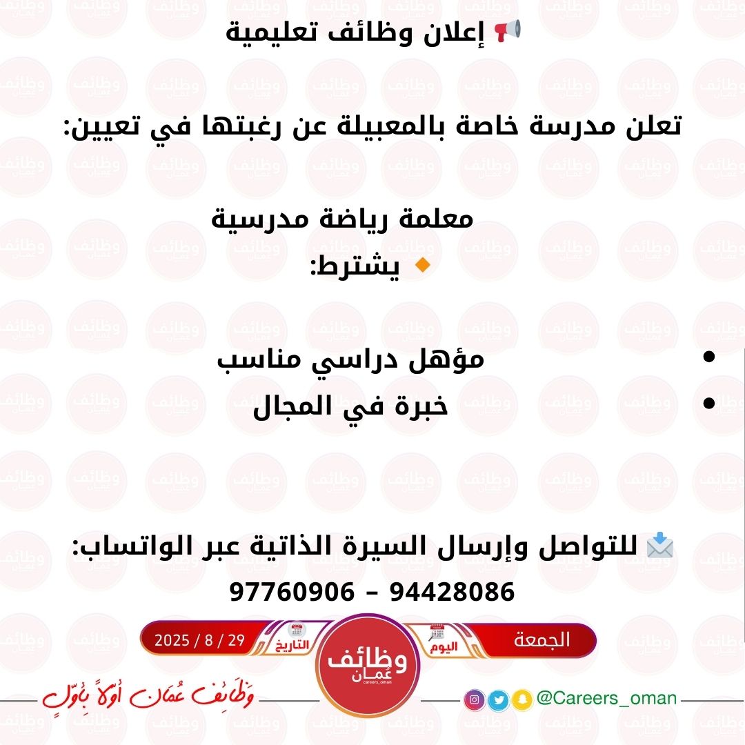 مدرسة خاصة في المعبيلة - وظيفة شاغرة ( معلمة رياضة مدرسية )