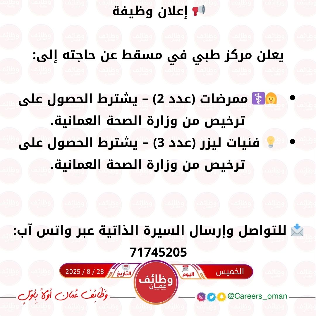 مركز طبي في مسقط - فرص وظيفية ( ممرضة + فنية ليزر )