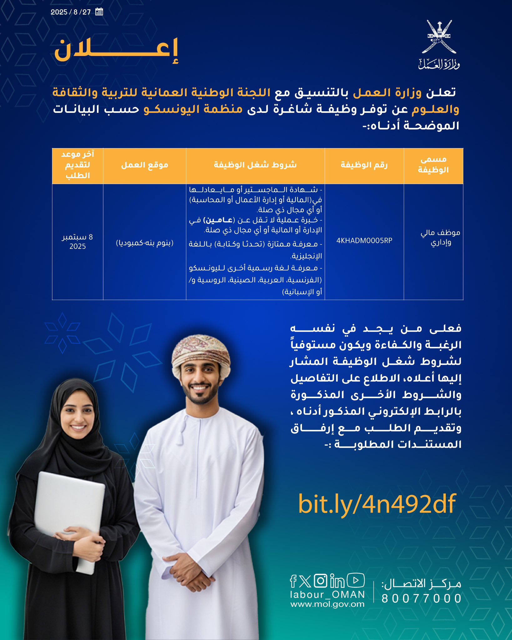 وزارة العمل وبالتنسيق مع اللجنة الوطنية العُمانية للتربية والثقافة والعلوم - وظيفة شاغرة لدى منظمة اليونسكو