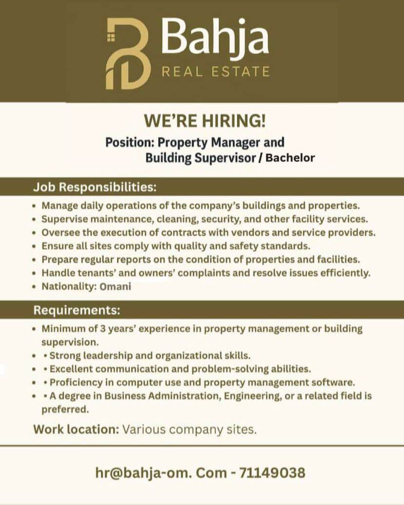 شركة بهجة العقارية - وظيفة شاغرة ( Property Manager and Building Supervisor / Bachelor )