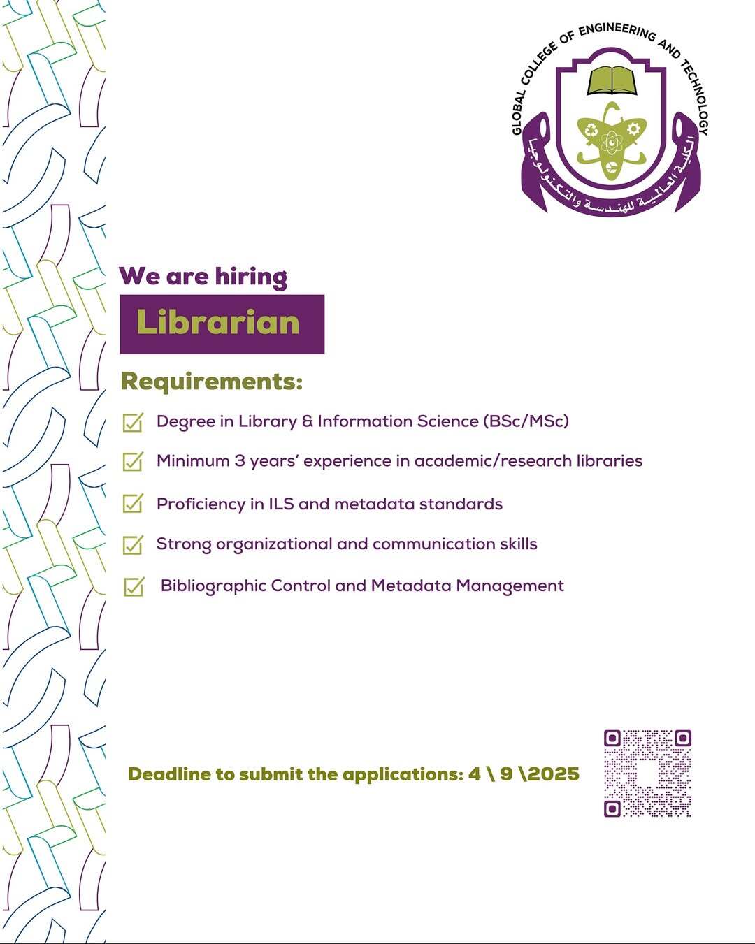 الكلية العالمية للهندسة والتكنولوجيا - وظيفة شاغرة ( أمين مكتبة )