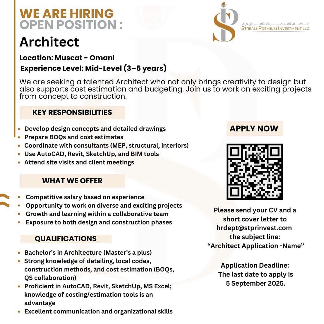 التدفق المتميز للاستثمار في مسقط - وظيفة شاغرة ( Architect )