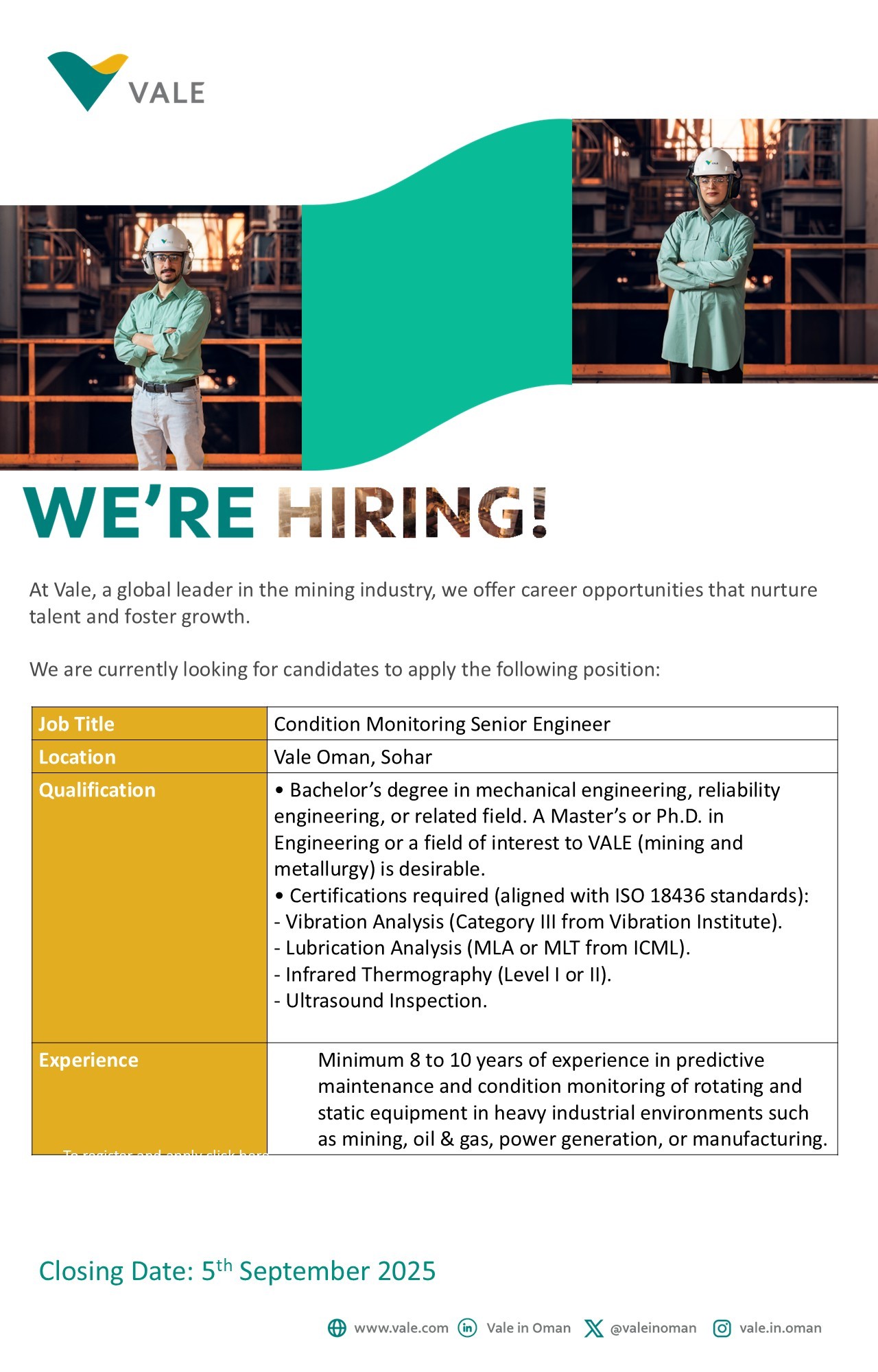 شركة فالي في عمان - وظيفة شاغرة ( Condition Monitoring Senior Engineer )