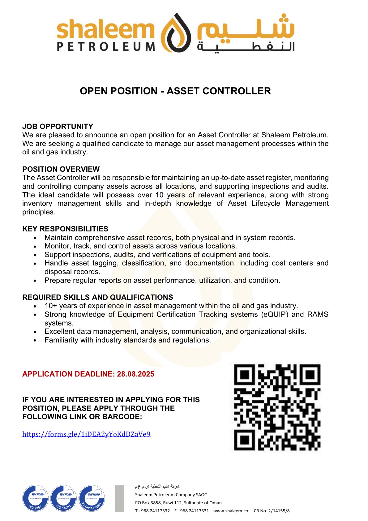 شركة شليم النفطية - وظيفة شاغرة ( ASSET CONTROLLER )