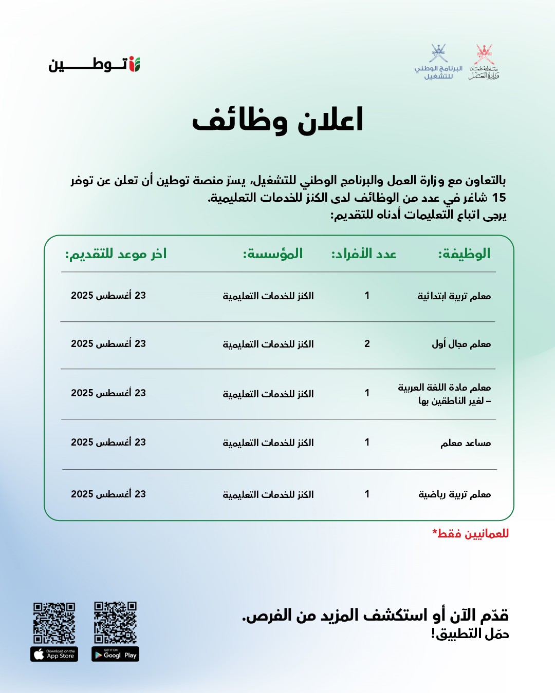 منصة توطين - 15 وظيفة شاغرة لدى الكنز للخدمات التعليمية