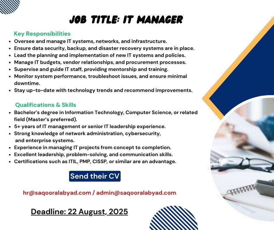 شركة الصقور الأبيض - وظيفة شاغرة ( IT MANAGER )
