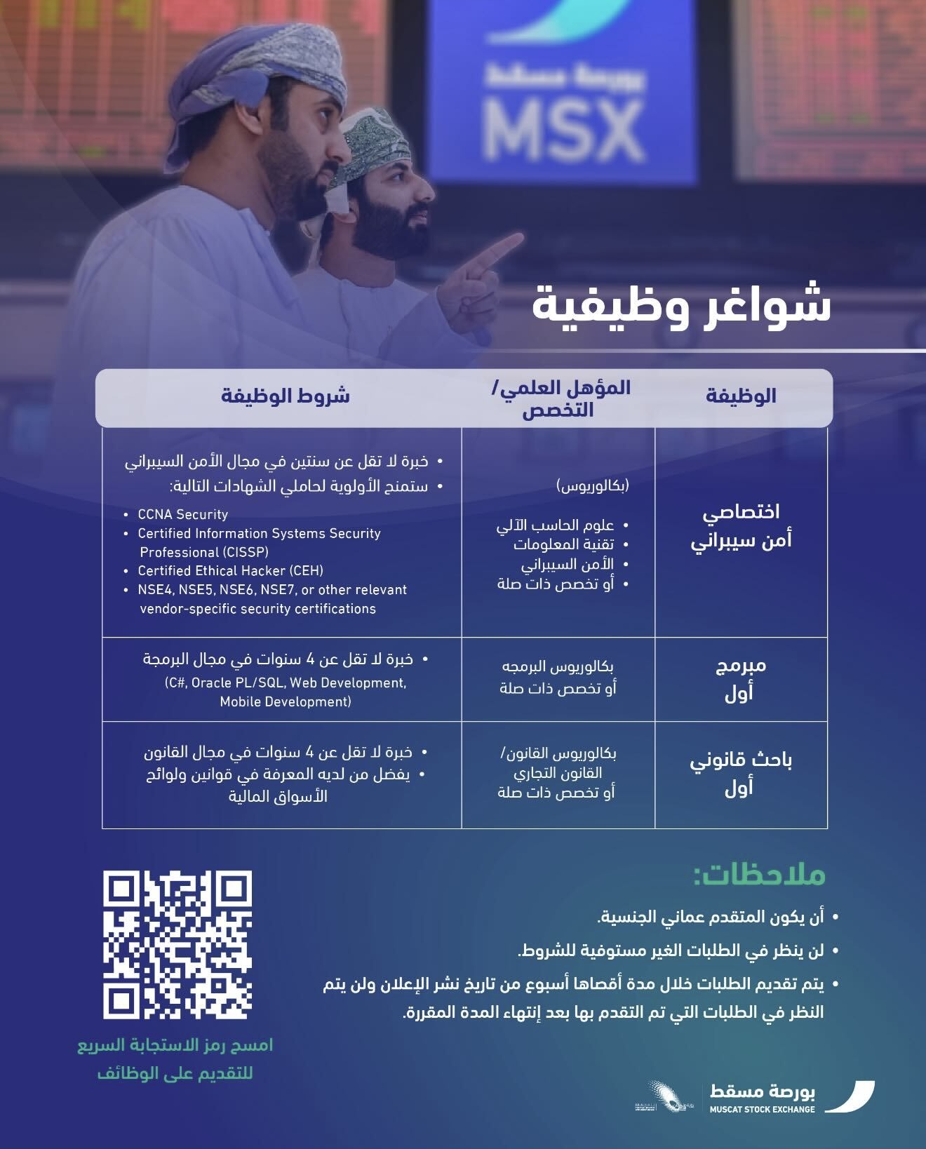 شركة بورصة مسقط - وظائف شاغرة ( اختصاصي أمن سيبراني + مبرمج أول + باحث قانوني أول )