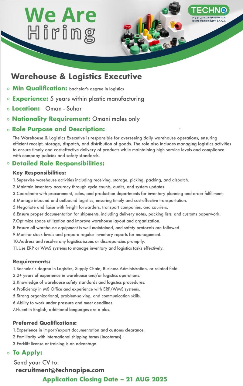 شركة صناعة تقنية البلاستيك في صحار - وظيفة شاغرة ( Warehouse & Logistics Executive )