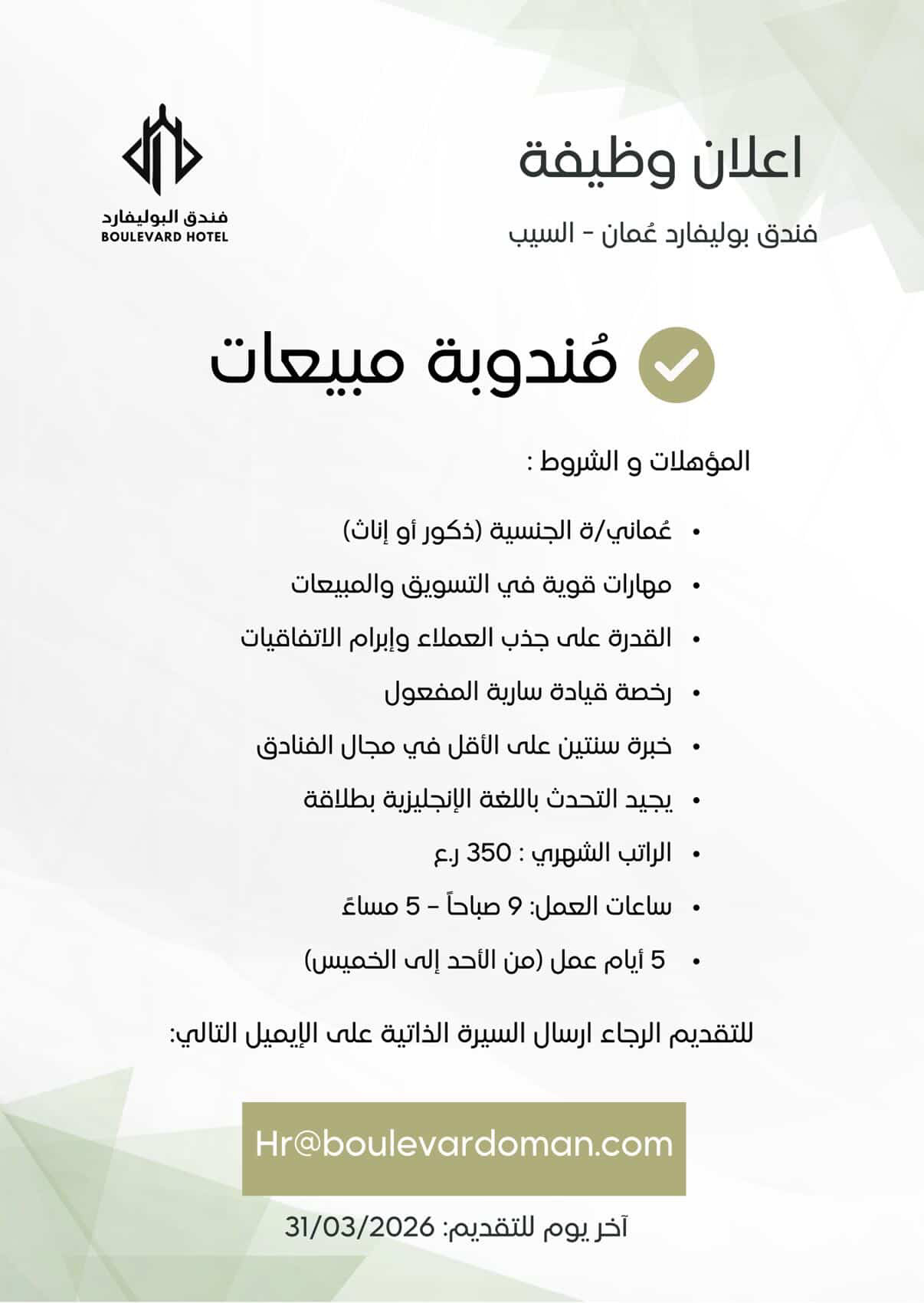 فندق بوليفارد في السيب - وظيفة شاغرة ( مندوبة مبيعات )
