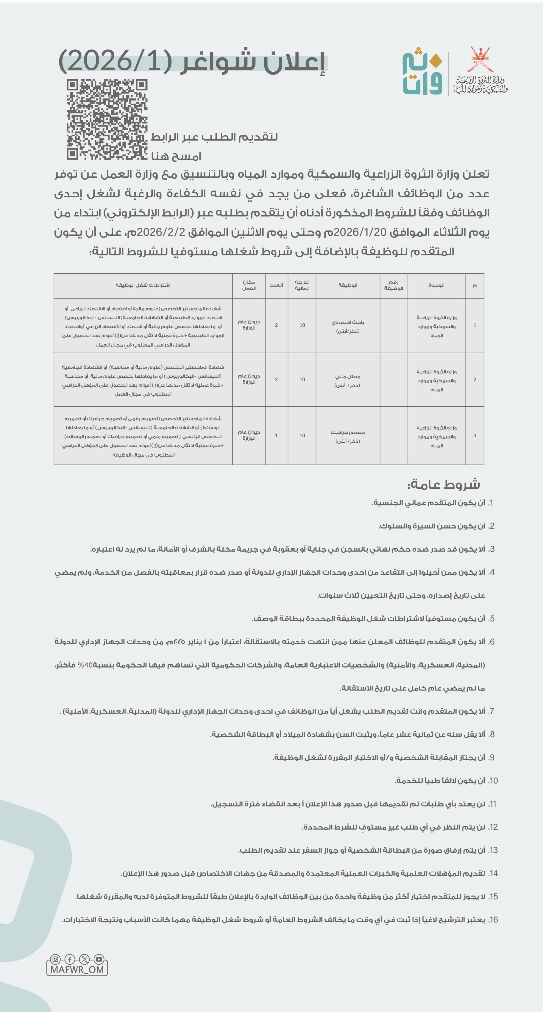 وزارة الثروة الزراعية والسمكية وموارد المياه - توفر عدد من الوظائف الشاغرة