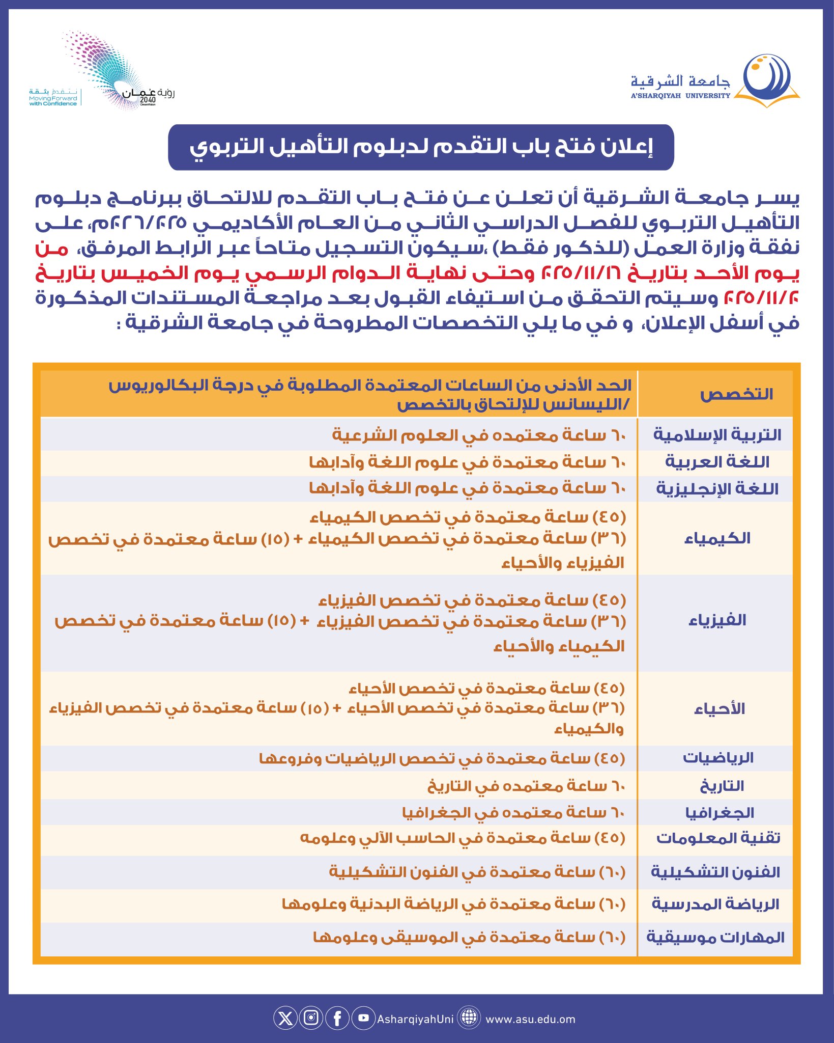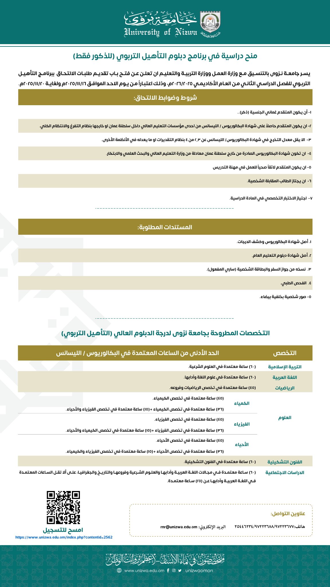 جامعة نزوى بالتنسيق مع وزارة العمل ووزارة التربية والتعليم - توفر منح دراسية في برنامج التأهيل التربوي