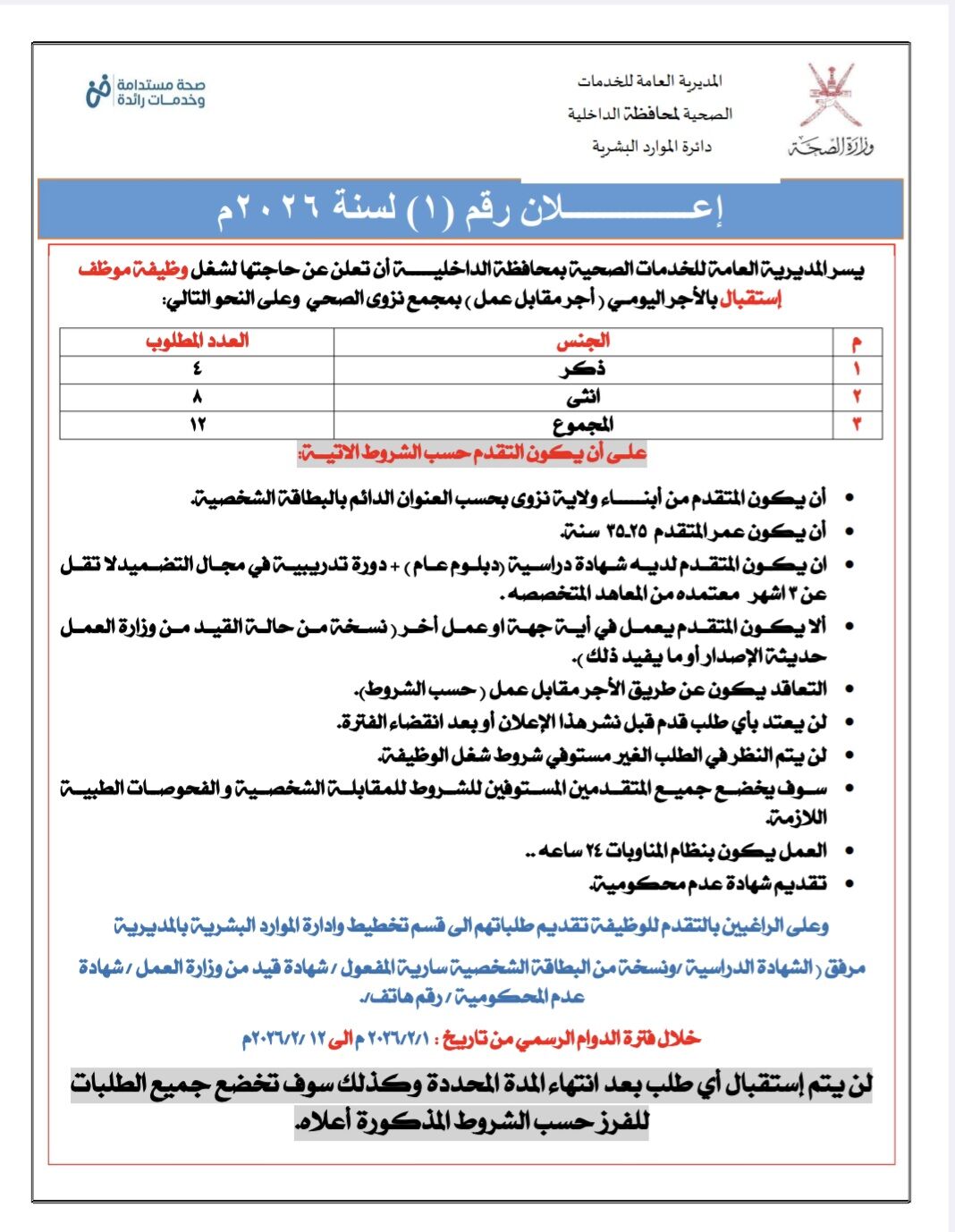المديرية العامة للخدمات الصحية بمحافظة الداخلية مجمع نزوى الصحي - وظيفة شاغرة ( موظف/ة استقبال العدد 12 )