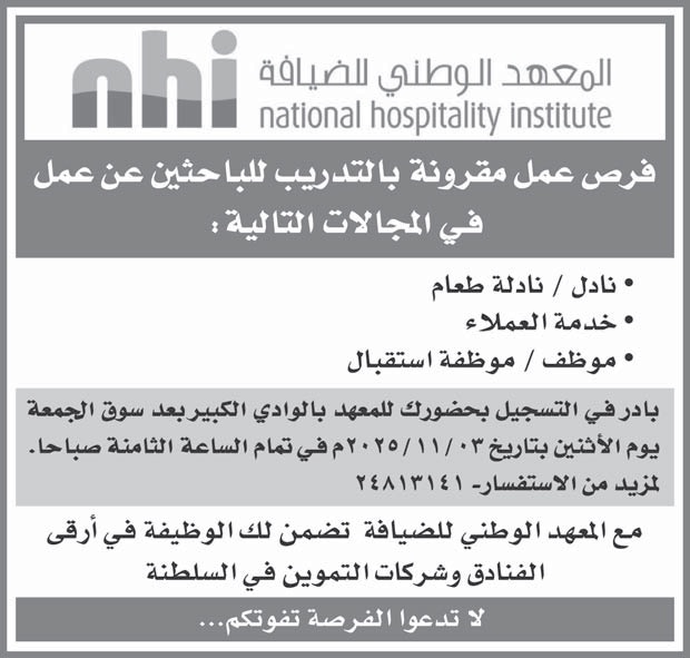 المعهد الوطني للضيافة - فرص عمل مقرونة بالتدريب للباحثين عن عمل في المجالات التالية ( نادل / نادلة طعام + خدمة العملاء + موظف / موظفة استقبال )