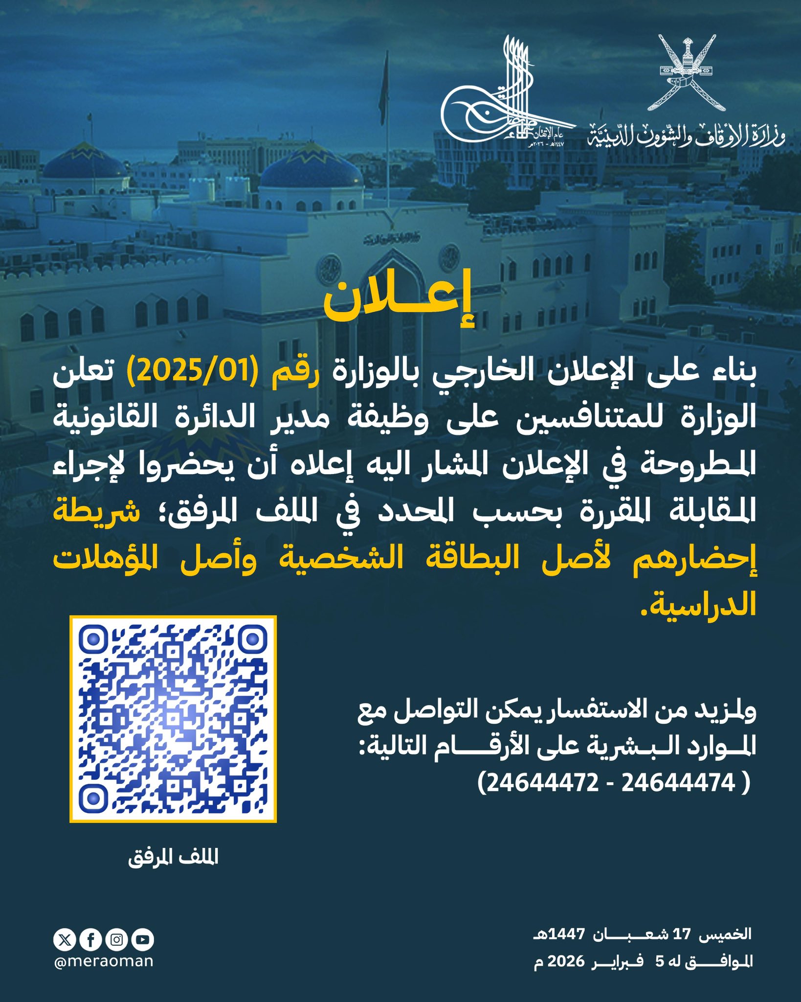 وزارة الأوقاف والشؤون الدينية – إعلان أسماء المتنافسين لإجراء المقابلة لوظيفة مدير دائرة الموارد البشرية