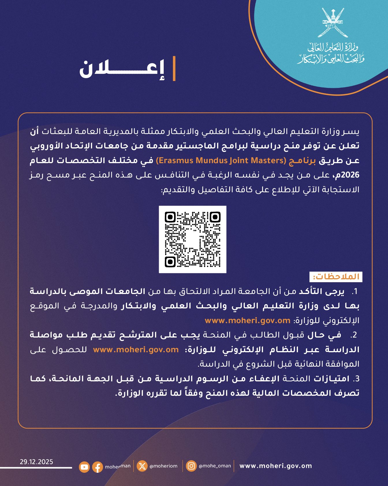 وزارة التعليم العالي والبحث العلمي والابتكار - إعلان منح دراسية لبرامج الماجستير مقدمة من جامعات الإتحاد الأوربي