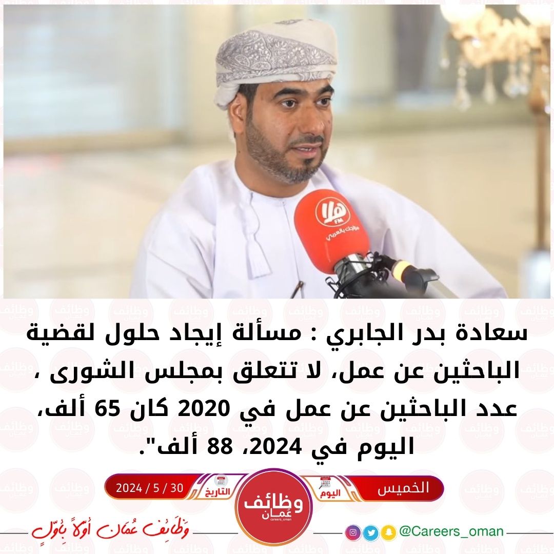 سعادة بدر الجابري : مسألة إيجاد حلول لقضية الباحثين عن عمل، لا تتعلق بمجلس الشورى ، عدد الباحثين عن عمل في 2020 كان 65 ألف، اليوم في 2024، 88 ألف".