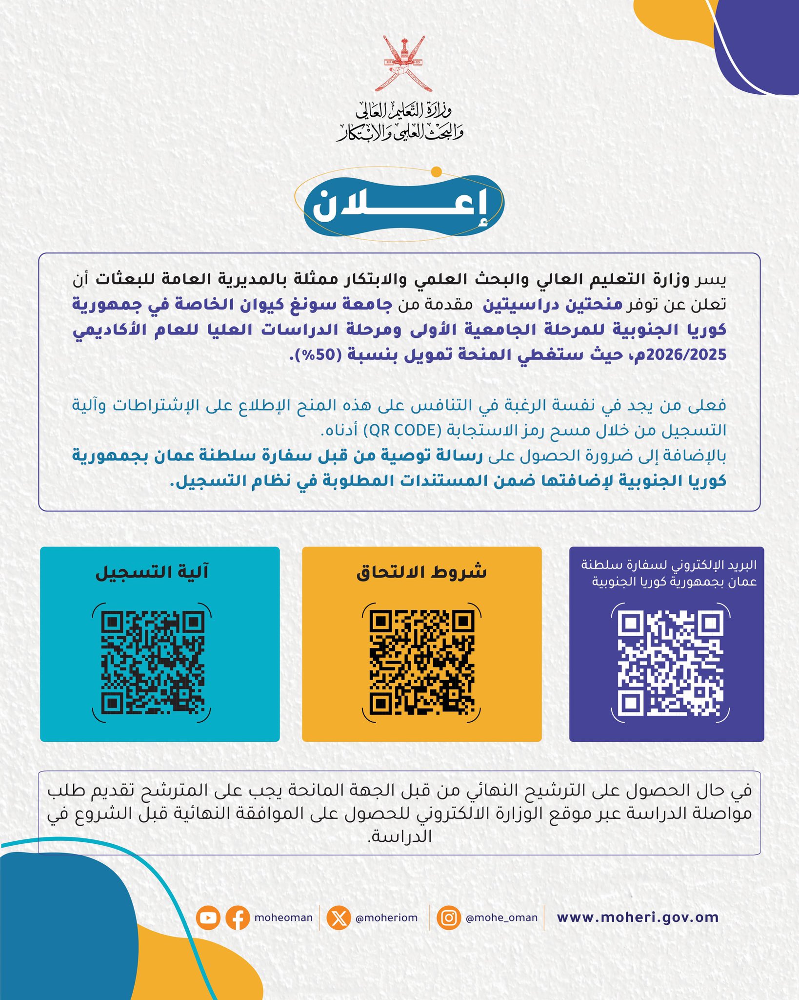 وزارة التعليم العالي والبحث العلمي والابتكار - منحتين دراسيتين مقدمة من جامعة سونغ كيوان الخاصة في جمهورية كوريا الجنوبية