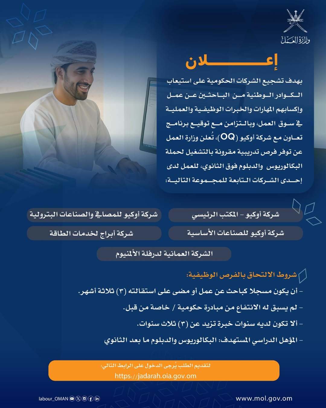 شركة أوكيو بالتعاون مع وزارة العمل - فرص تدريبية مقرونة بالتشغيل لحملة البكالوريوس والدبلوم فوق الثانوي