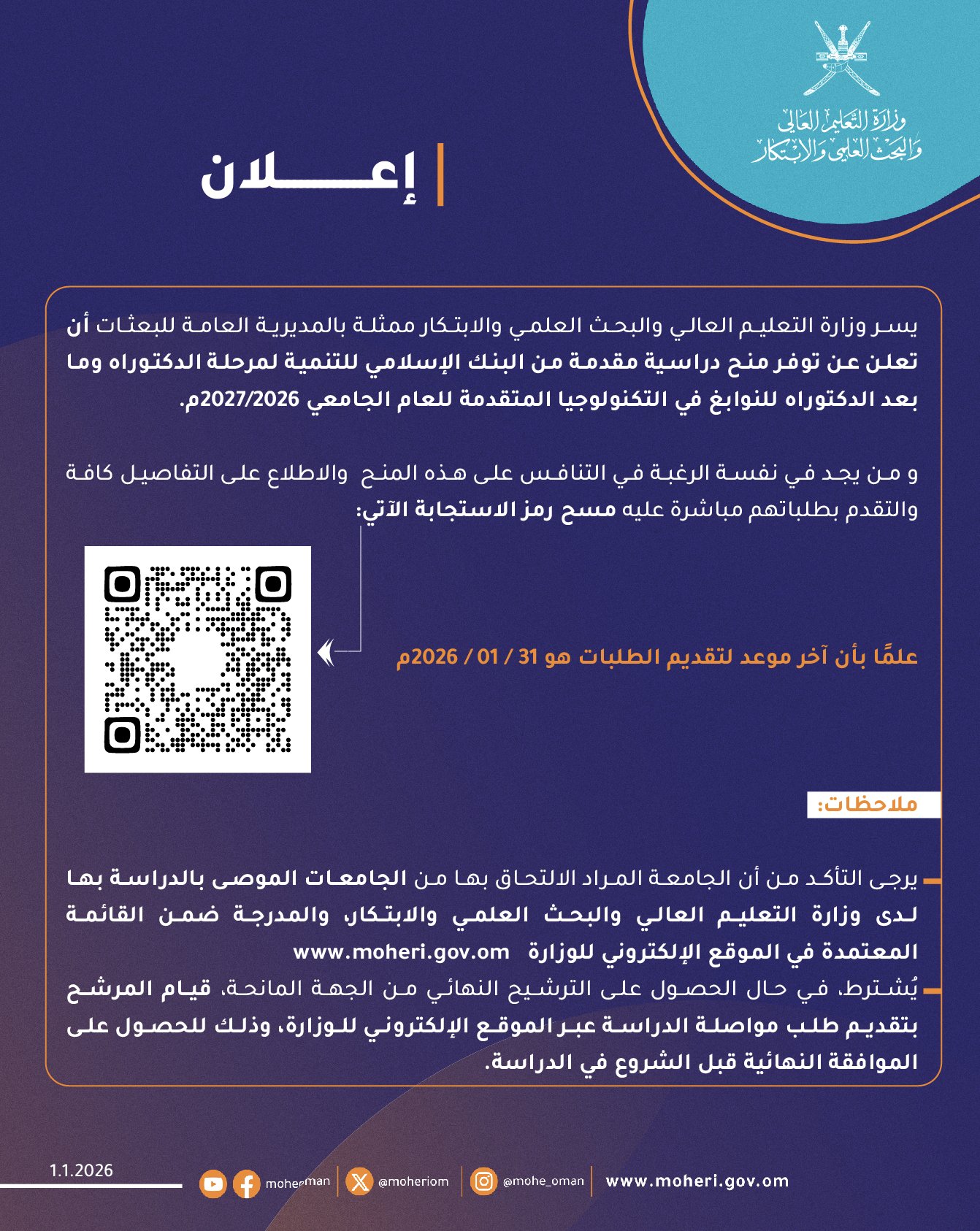 وزارة التعليم العالي والبحث العلمي والابتكار - منح دراسية مقدمة من البنك الإسلامي للتنمية لمرحلة الدكتوراه