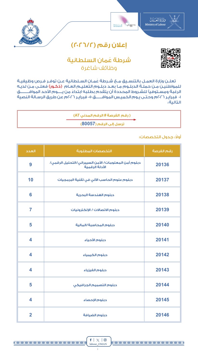 شرطة عمان السلطانية - فتح باب التجنيد لحملة الدبلوم ما بعد دبلوم التعليم العام (ذكور)