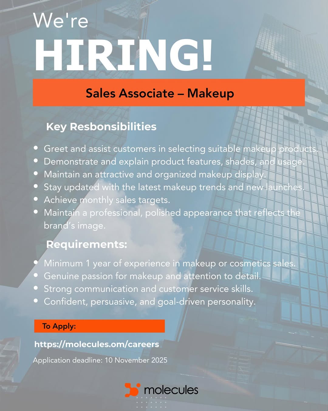 شركة جزيئات في مسقط - وظيفة شاغرة ( موظفة مبيعات - مكياج )