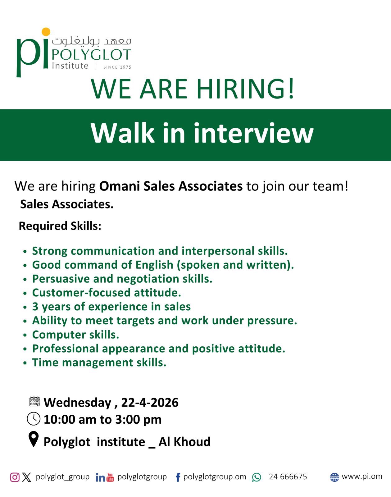 معهد بوليغلوت فرع الخوض - مقابلة مباشرة لشغل وظيفة ( Sales Associates )