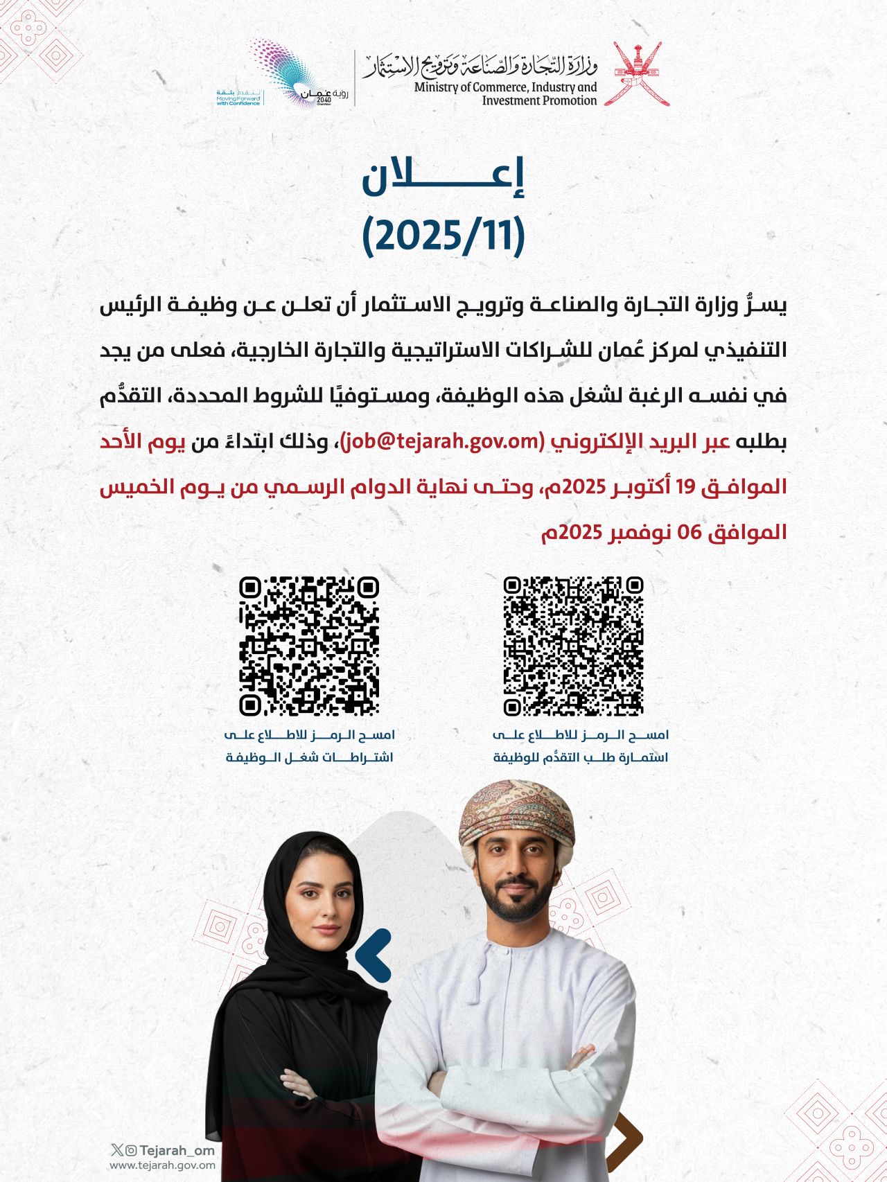 وزارة التجارة والصناعة وترويج الاستثمار - وظيفة شاغرة ( رئيس تنفيذي لمركز عُمان للشراكات الاستراتيجية والتجارة الخارجية