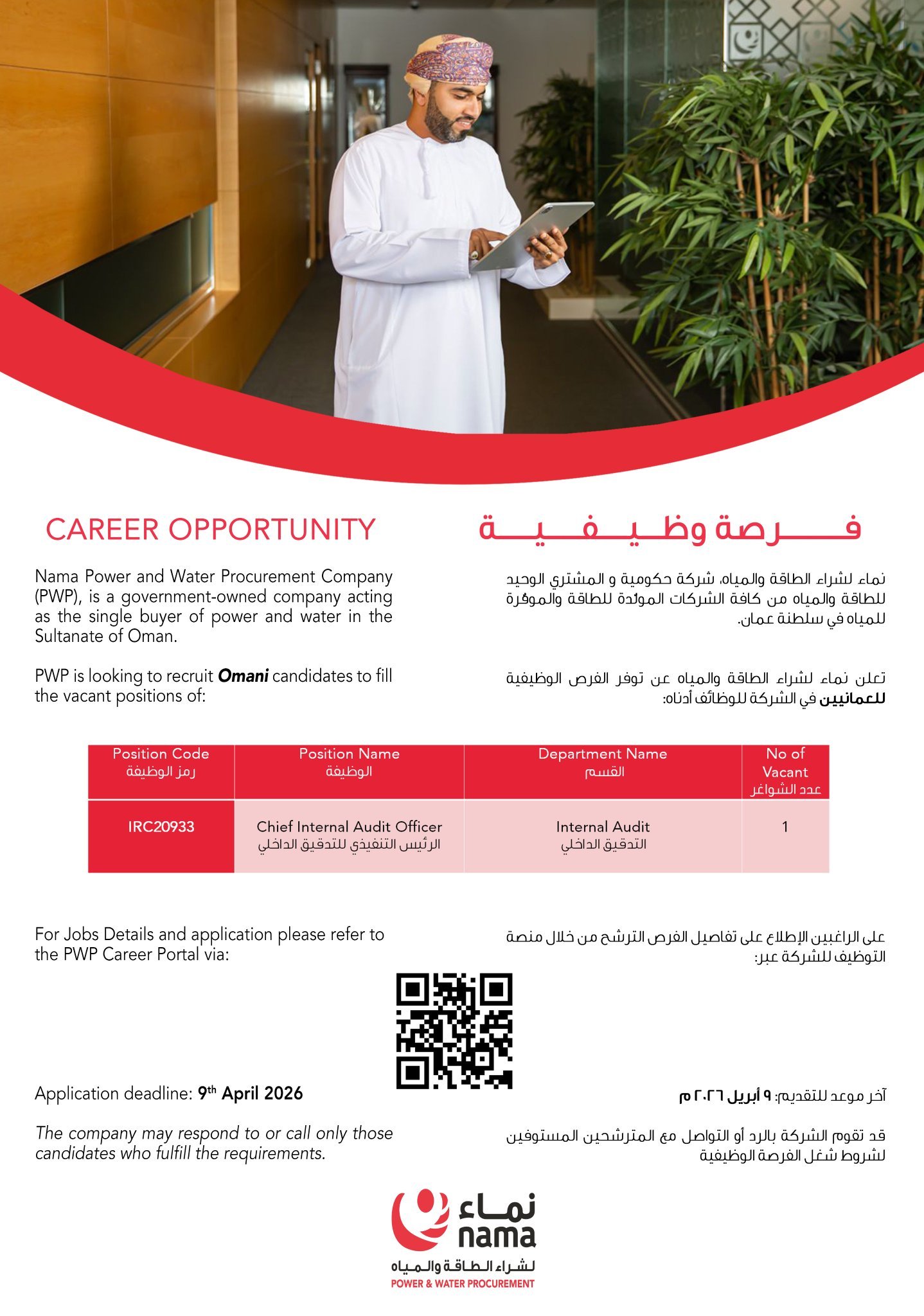 شركة نماء لشراء الطاقة والمياه - وظيفة شاغرة ( الرئيس التنفيذي للتدقيق الداخلي )